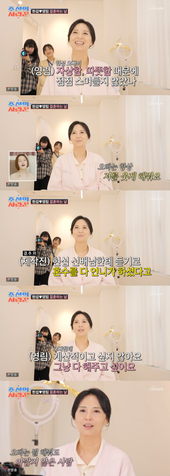 그러자 정영림은 "예전에도 그랬고 앞으로도 그렇겠지만 저는 오빠한테 계산적이고 싶지 않다. 그냥 다 해주고 싶다. 오빠는 뭘 해줘도 아깝지 않은 사람이다"고 설명했다.