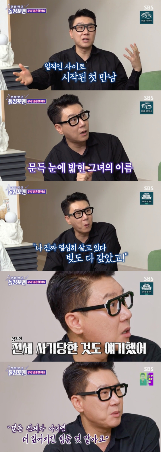 이어 "내가 먼저 사귀자고 얘기했다"며 "내 마음은 모 아니면 도였기 때문에 '나 정말 열심히 살고 있고 빚도 다 갚았고 전세사기 피해도 당했다. 결혼 전제가 아니면 더 깊어지기는 힘들 것 같다'고 말했더니 며칠 고민하겠다고 하더라. 며칠 뒤 아내가 '고민을 함께 해결하는 시간이 즐거웠다. 앞으로도 이런 얘기만 나눠도 행복할 것 같다'고 하더라"고 러브 스토리를 털어놨다.