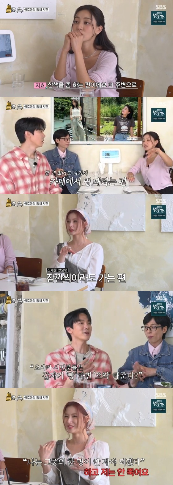 그는 "저는 원래 밤을 별로 안 좋아해서 낮에 많이 돌아다닌다. 할 게 없으면 카페라도 와서 밖에 앉아있는다"라고 덧붙였다. 이에 유연석이 "그럼 사람들이 너무 많이 알아보지 않느냐"고 놀라워하자 지효는 "제가 여기 사는 걸 주민분들이 너무 많이 아시니까 그냥 그런가 보다 한다"라고 답해 웃음을 안겼다.