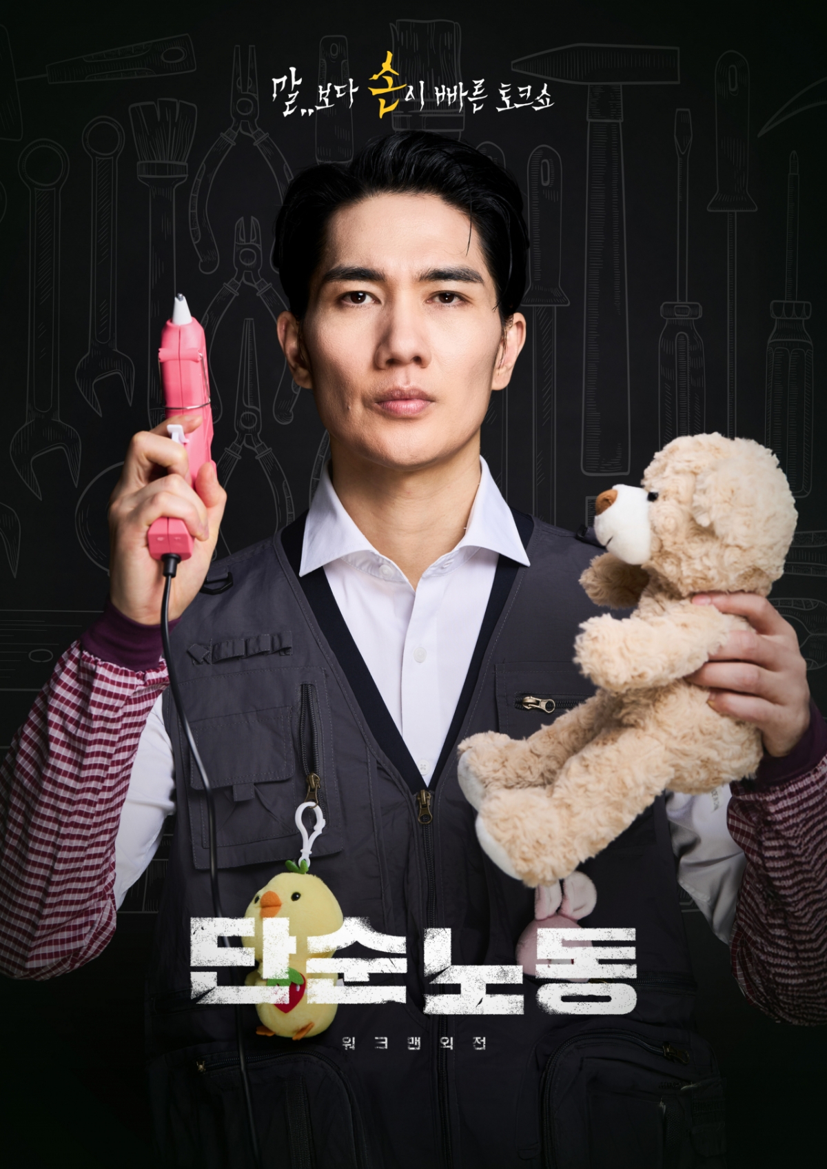 지난 20일 공개된 메인 포스터에는 "말..보다 손이 빠른 토크쇼"라는 문구와 함께 작업 조끼를 입고 한 손에는 분홍색 글루건, 다른 손에는 인형을 든 채 진지한 눈빛으로 정면을 응시하는 엄태구의 모습이 담겼다. 진중한 표정과 대비되는 귀여운 소품이 절묘한 조화를 이루며 프로그램에 대한 궁금증과 기대감을 높이고 있다.