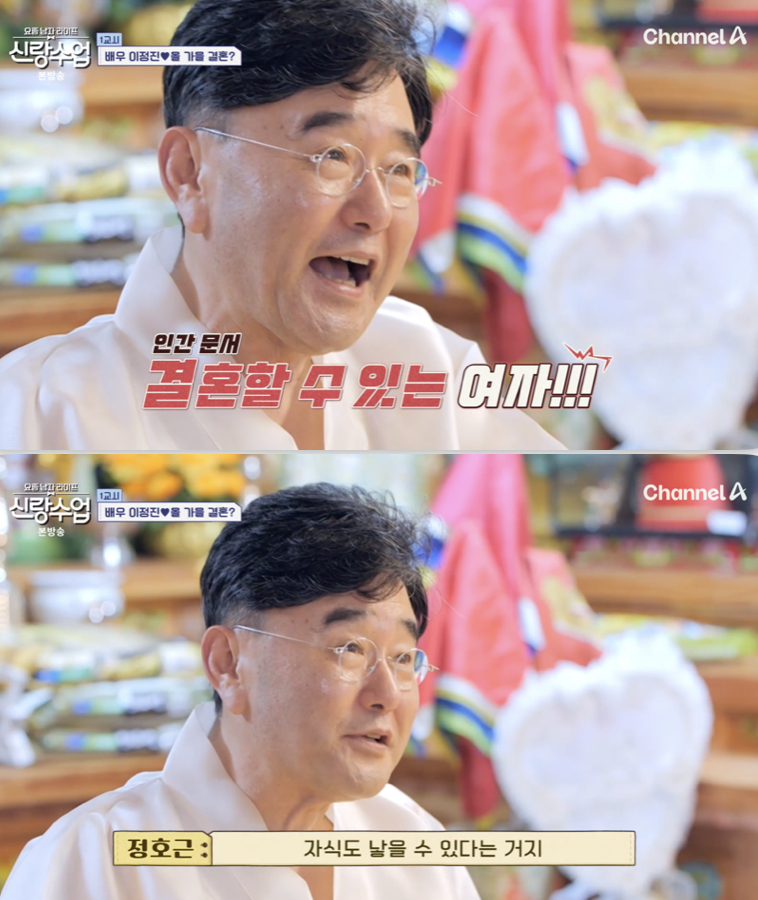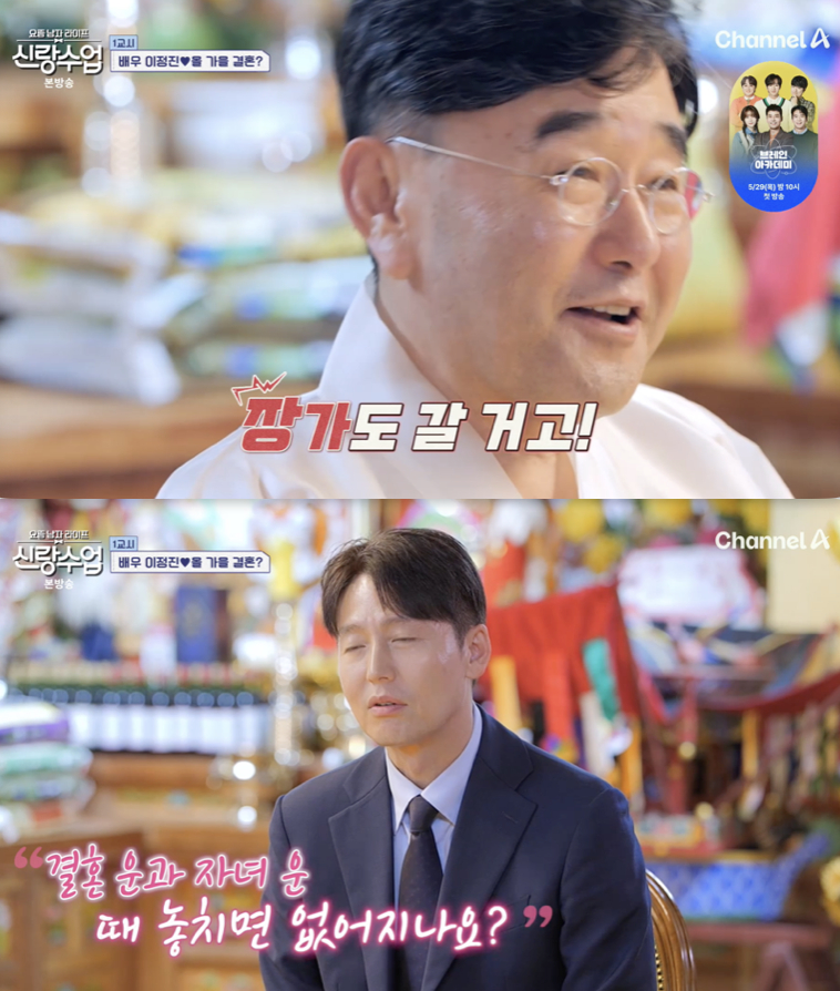 21일 방송된 채널A '요즘 남자 라이프 – 신랑수업'에서는 배우 이정진이 새롭게 '4학년 6반' 멤버로 합류한 가운데, 인생 선배이자 무속인으로 활동 중인 정호근을 찾아가 인생 상담을 받는 모습이 그려졌다.