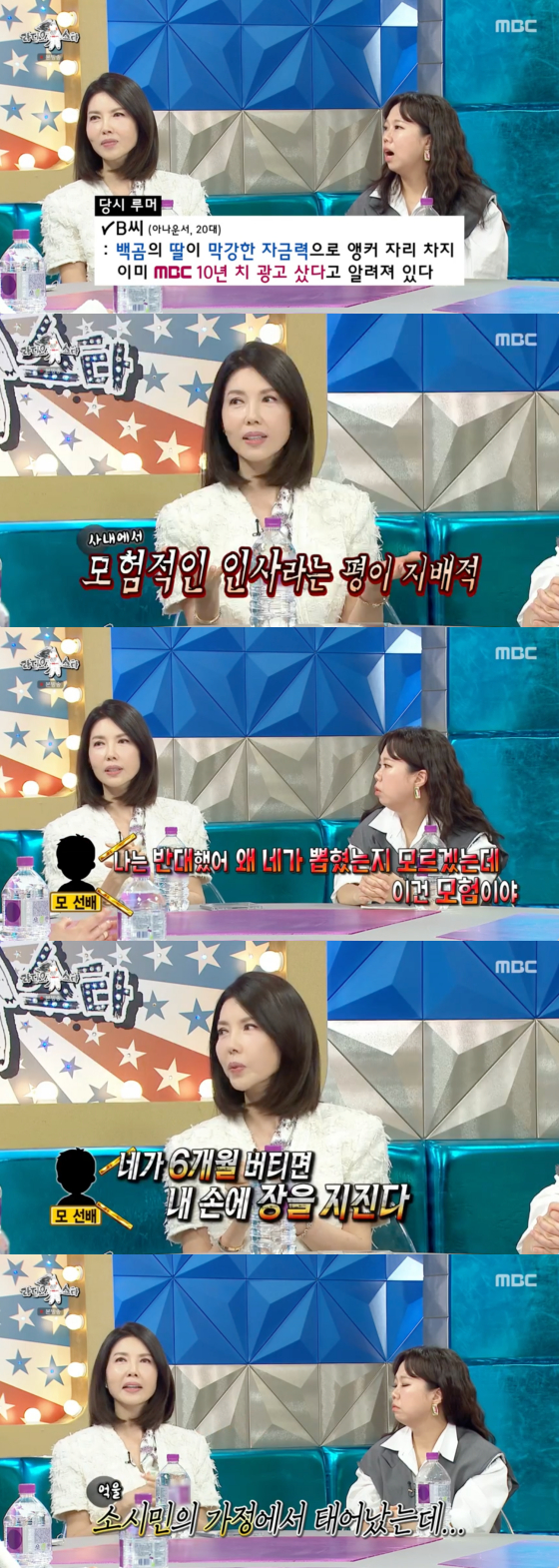 이어 "제가 백씨라서 증권가 큰손 '백곰'의 딸이라는 소문이 돌았다. 막강한 자금력으로 앵커 자리를 차지하고 MBC 10년치 광고를 샀다는 소문까지 돌았다. 당시 회사에서도 반대가 많았다. 중요한 뉴스인데 수습사원이 앵커 자리를 맡는 건 모험이었기 때문"이라고 털어놨다.