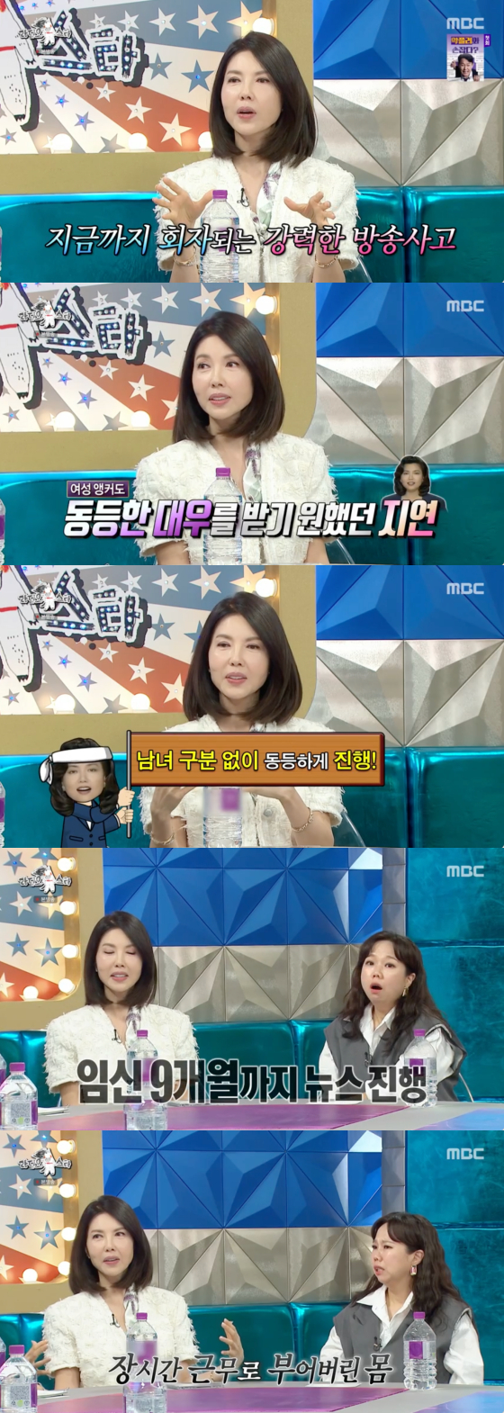 그러면서 "결혼하면 일을 그만둬야 하는 시대라 임신 9개월 때까지 뉴스를 진행했다. 총 14시간 근무를 했더니 임신 중독증처럼 몸이 부었다. 슬리퍼를 신고 뉴스를 할 수 있을 때까지 했다"고 전해 놀라움을 자아냈다.