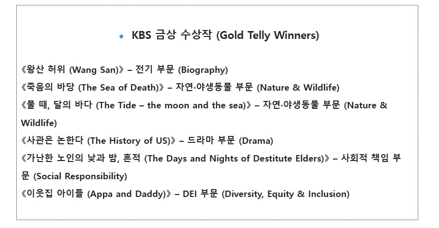 이번 수상은 다큐멘터리, 드라마, 사회 공헌, 지속가능성 등 다양한 분야에 걸쳐 이루어져, KBS의 폭넓은 제작 역량과 공영미디어로서의 역할을 국제적으로 인정받은 결과다.