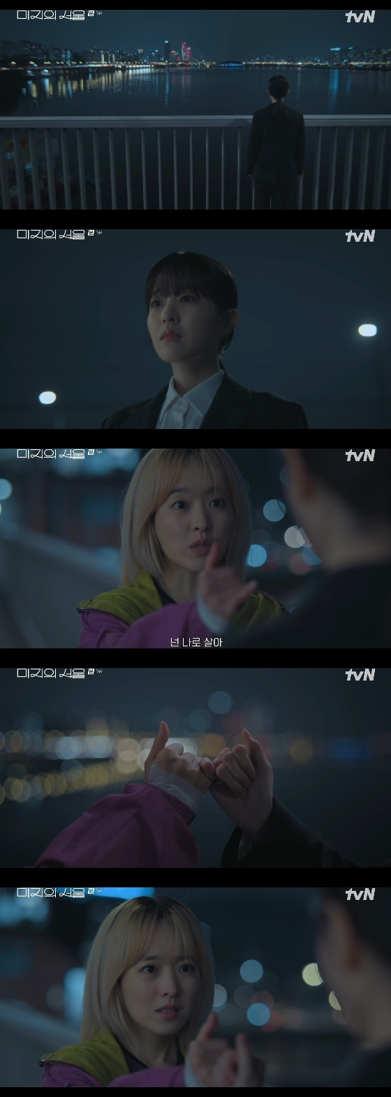 미지는 한강 다리 위에서 텅 빈 표정으로 강물을 내려다보던 미래를 붙잡고 깜짝 제안을 내놨다. 그는 "관두지도 말고, 버티지도 마. 대신해 줄게. 옛날처럼. 내가 너로 살게. 넌 나로 살아"라고 비밀 약속을 제안했다.
