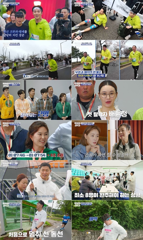 그런가 하면, 율희는 마라톤 중반 고비를 맞아 계속 눈물을 쏟았지만, 악으로 깡으로 결승선을 통과했다. 곧장 바닥에 쓰러진 그는 제작진과의 인터뷰에서 앞서 오열했던 이유에 대해 "눈앞에 아이들 얼굴이 스쳐 지나가면서 갑자기 울컥하는 거다. 숨 쉬는 것도 힘들고, 감정도, 호흡도, 내 몸도 컨트롤할 수 없어 괴로웠다"고 털어놨다. 손정은, 김승진, 안성훈 역시 각자의 고비를 넘기며 완주했고, '하위권 그룹' 허재, 양준혁, 최준석도 지옥 훈련 덕분인지 마지막까지 투혼을 발휘했다.