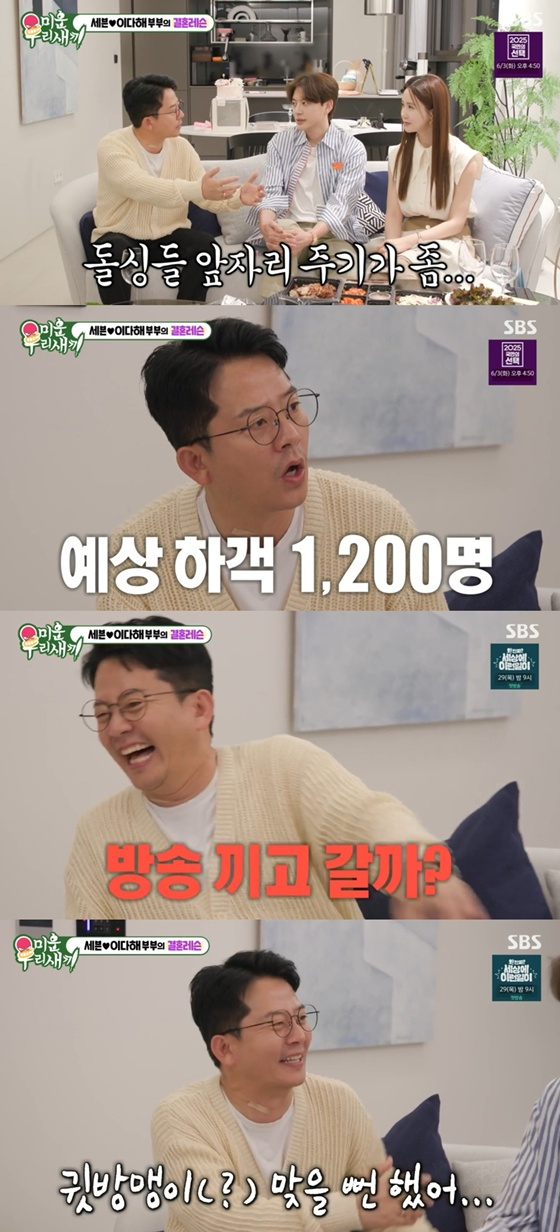 이날 김준호는 결혼을 앞두고 세븐, 이다해 부부를 만나 고민을 털어놨다. 그는 "예약은 하객 1200명이다. 그리고 배치도 중요하지 않나. 이혼한 사람들 앞에 앉기가 좀 그렇지 않나. 그렇다고 맨 뒤로 할 수도 없고"라고 말했다.