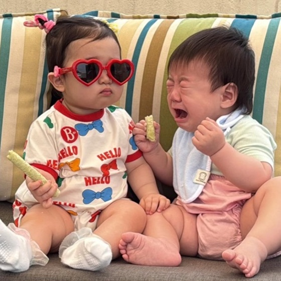 공개된 사진 속에는 이은형 아들 현조와 랄랄 딸 서빈이가 나란히 앉아 있는 모습이 담겼다. 울고 있는 현조 옆에 서빈이는 선글라스를 끼고 무심한 표정을 짓고 있어 귀여움을 자아낸다.