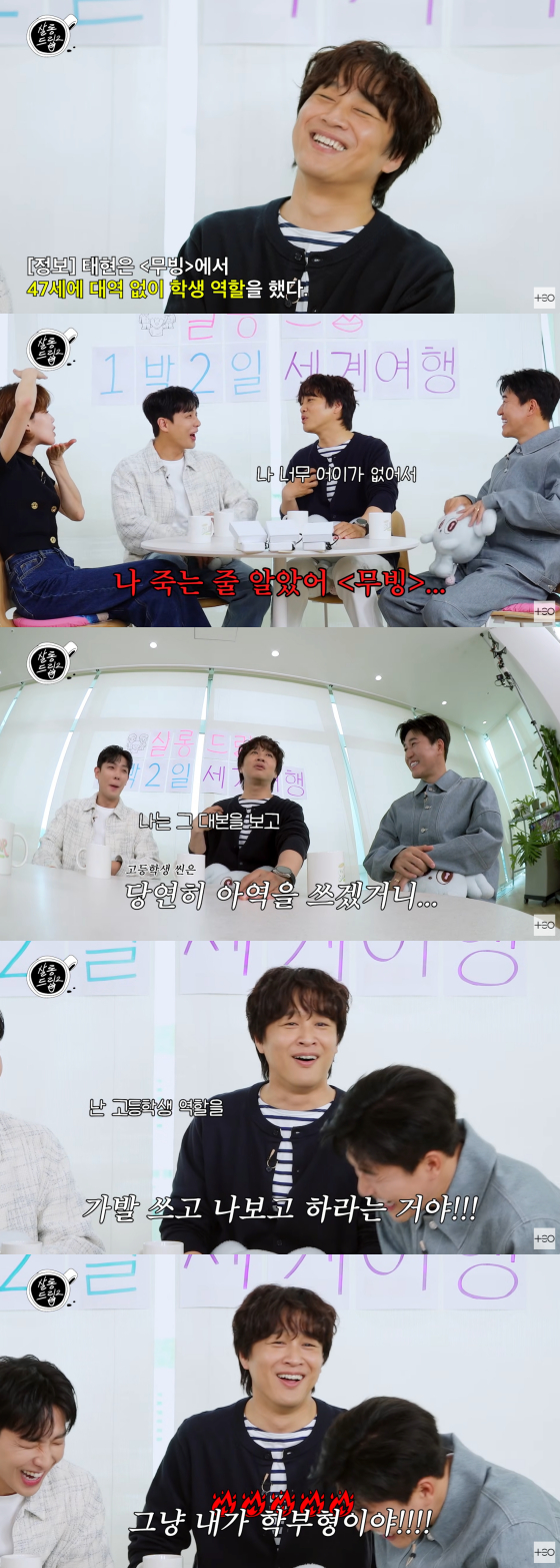 앞서 차태현은 '무빙'에서 고등학생 연기를 해 화제를 모았다. 그는 "나는 당연히 아역을 쓰는 줄 알았다. 다른 배우들은 다 아역을 썼다"고 밝혔다.