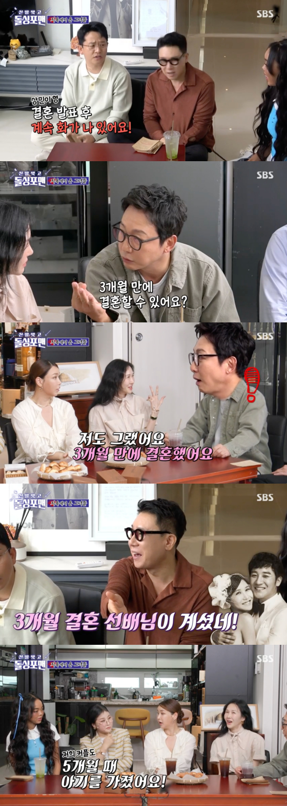 탁재훈은 박선주, 배윤정, 윤혜진을 향해 "내가 한번 물어보겠다. 만난 지 3개월 만에 결혼하는 게 가능한 거냐"고 물었다.