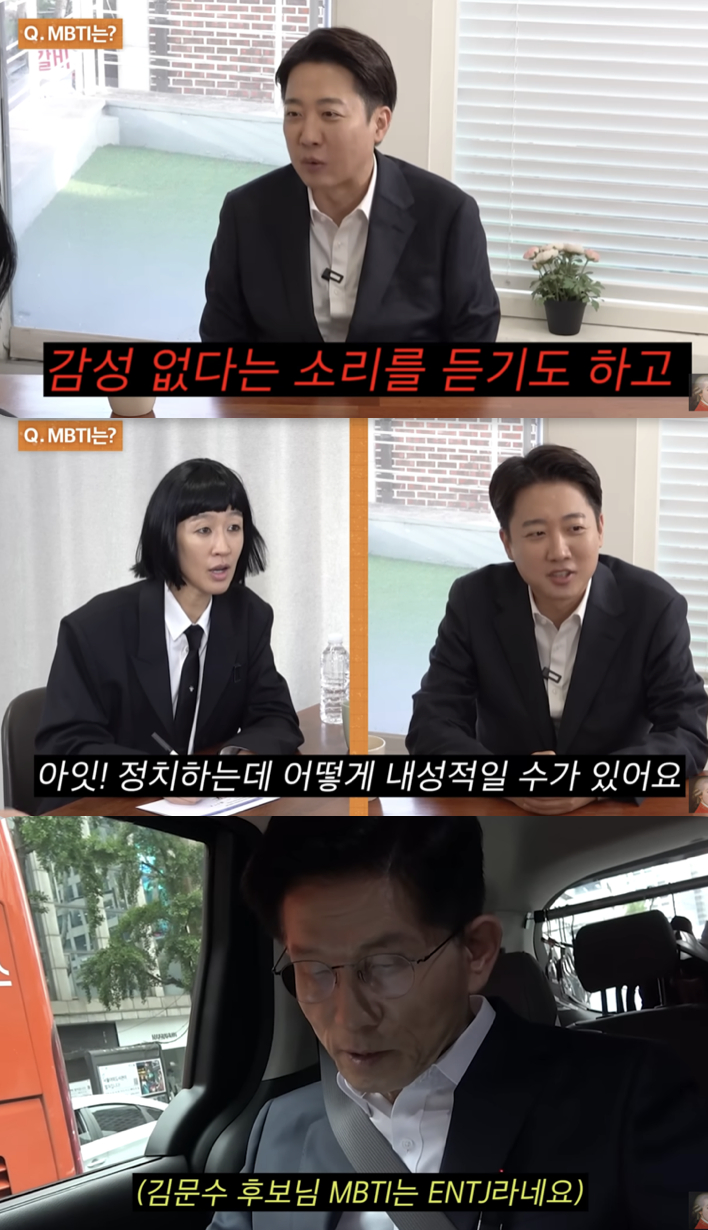 김문수 후보는 제작진과의 사전 인터뷰에서 "ENTJ"라고 밝히며 질문에 답했다. 이준석 후보는 "정치하는데 어떻게 내성적일 수가 있냐. 원래 고등학생 때부터 밖에서 이것저것 많이 하고 다녔다. E는 맞다"라고 말하며 자신의 MBTI를 "ESTP"라고 소개했다.