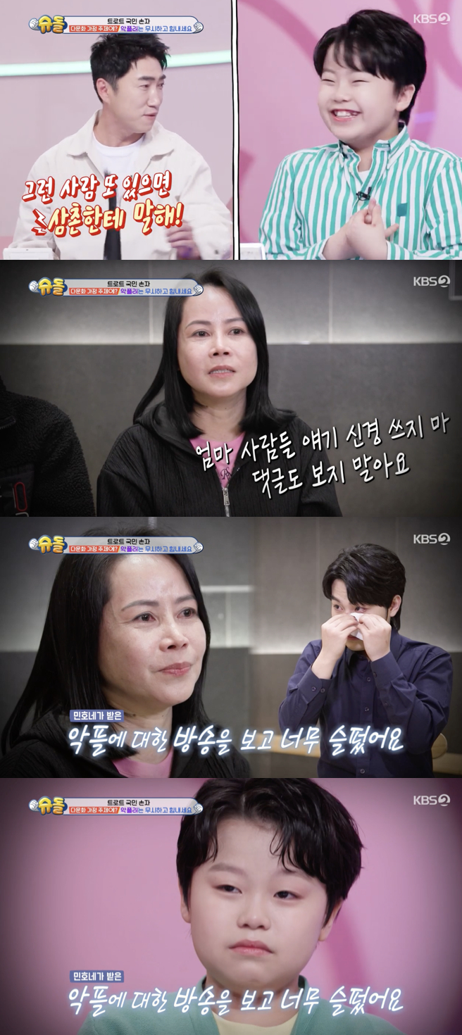 특히 미국에서 보내온 한 장문의 메시지는 시청자들의 마음을 울렸다. 메시지에는 "혹시 이 글을 읽으실지 모르겠지만 '파이팅'이라고 말하고 싶었다. 0.0001%의 사람들 때문에 다시는 슬퍼하지 마세요. 두 분 다 예의 바르고 재능이 넘치세요. 계속 웃으면서 어떤 거에도 흔들리지 말아라"라는 진심 어린 위로가 담겨 있었다.