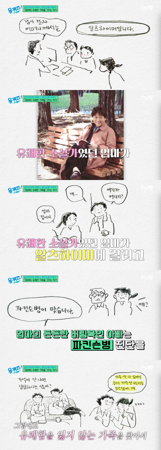 엄유진은 "부모님은 우리 삼남매를 각자 생긴 대로 살도록 내버려두자는 신념을 갖고 계신 분들이었다"면서 "웹툰 연재 1년쯤 지났을 때 엄마가 알츠하이머 진단을 받았다"고 전했다.