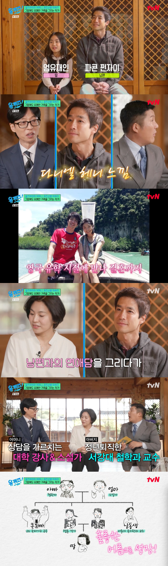 유재석은 엄유진 가족들에 대해 "어머니는 대학 강사 겸 소설가, 아버지는 정년퇴직한 서강대 철학과 교수"라며 "(엄유진의) 오빠는 UN 국제기구에서 근무 중이고 남동생은 서울대 윤리학과 교수다. 각자 자신의 자리에서 살고 있다는 느낌이 든다"고 소개했다.
