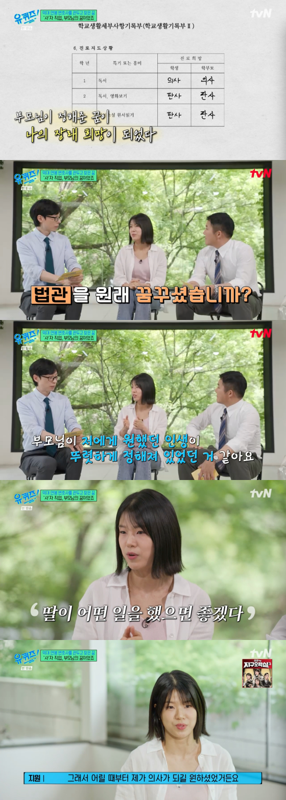 박지원은 "부모님이 저에게 원한 인생이 뚜렷하게 정해져 있었던 것 같다. '사' 자 들어가는 직업을 가지는 게 딸의 인생에 있어 가장 좋을 거라는 확신이 있었던 분들"이라고 말문을 열었다.