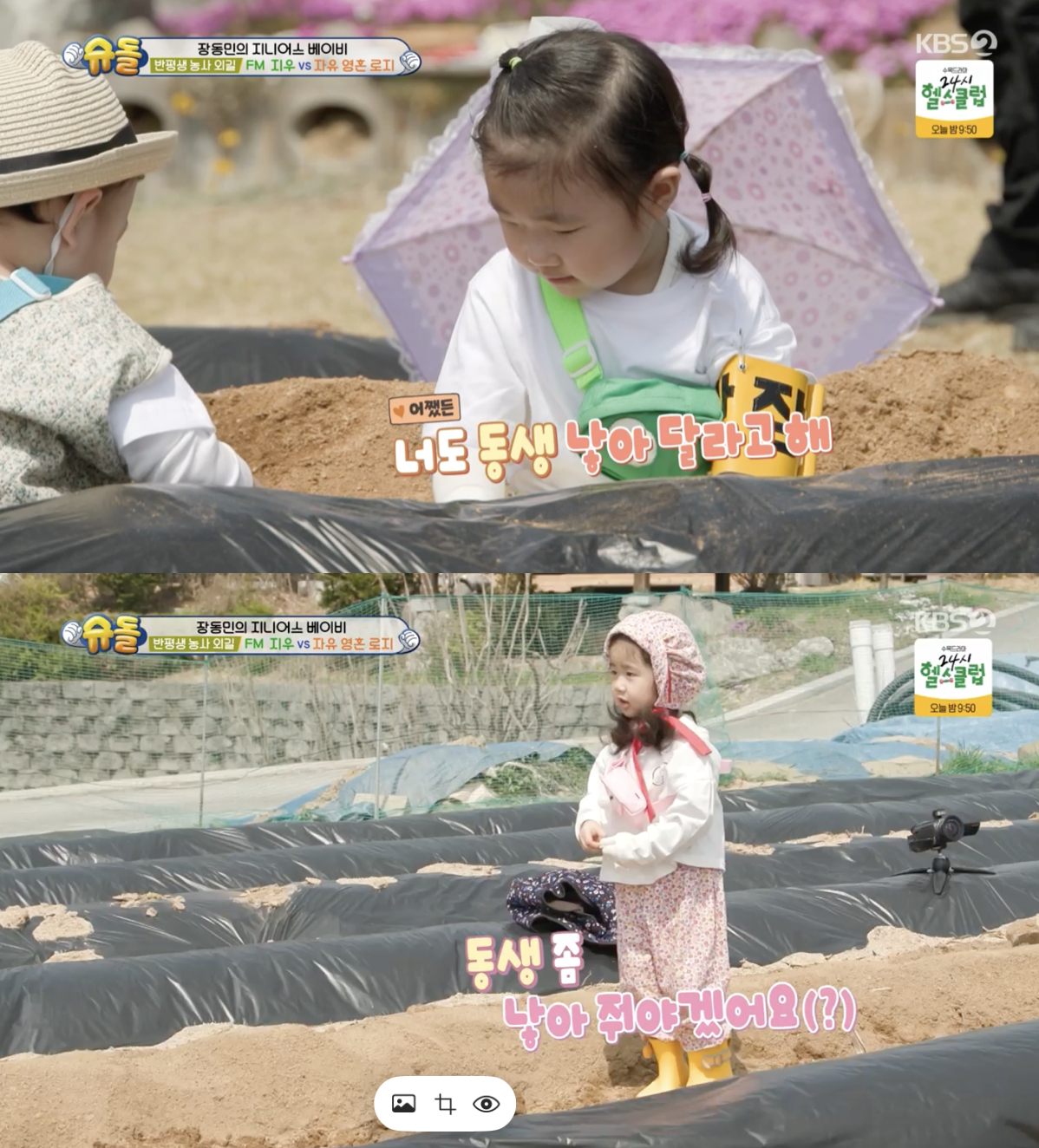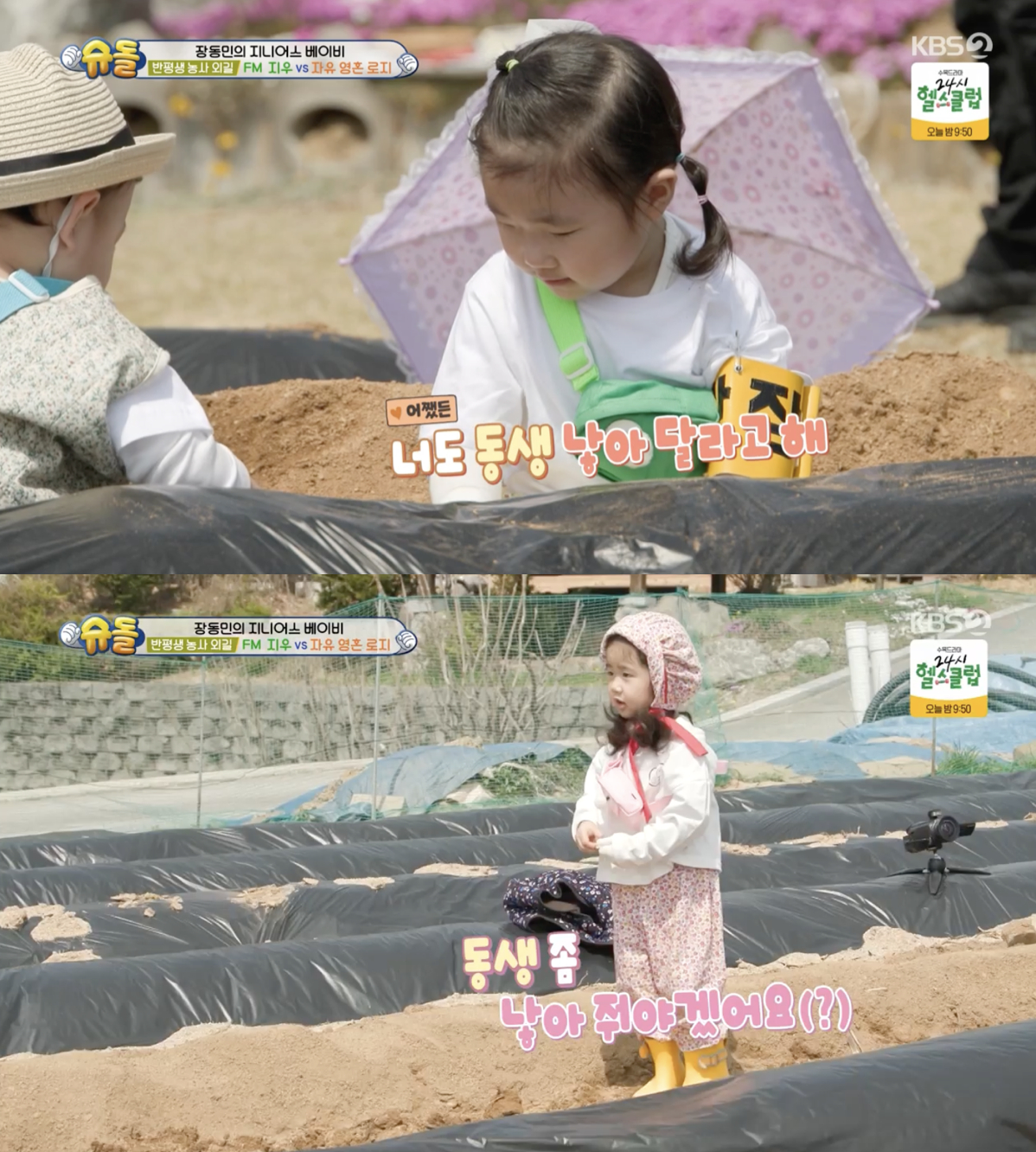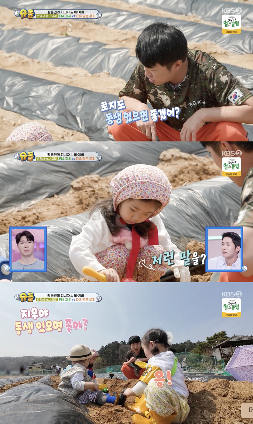 모종을 심는 중 장동민은 로지에게 지우의 동생 시우를 소개하며 "로지도 동생 있으면 좋겠어?"라고 물었다.