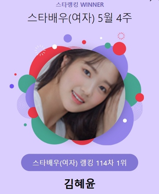 김혜윤은 지난 22일 오후 3시 1분부터 29일 오후 3시까지 진행된 5월 4주(114차) 스타랭킹 스타배우 여자 랭킹 투표에서 1위를 기록했다.