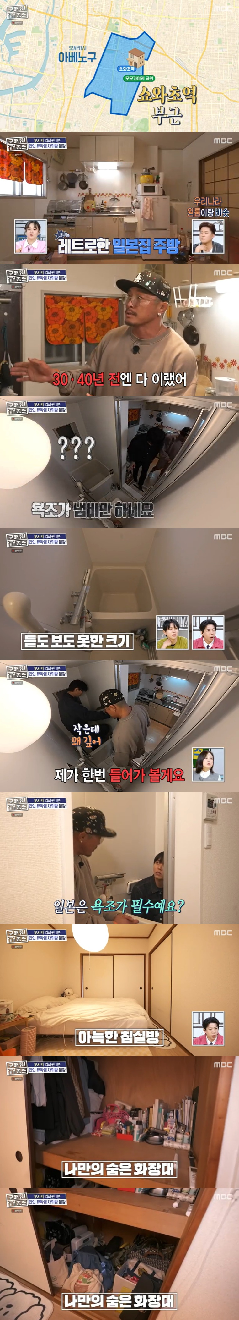 두 사람은 오사카시 아베노구 쇼와초역 근처의 자취방을 찾아갔다. 첫 번째 자취방은 레트로한 느낌이 돋보였다. 이 집은 작은 욕조와 창고 같은 수납장이 눈길을 끌었다. 주우재는 "욕조가 냄비만 하다"라며 놀랐고, 추성훈은 "일본집에는 무조건 욕조가 있다"라고 설명했다.