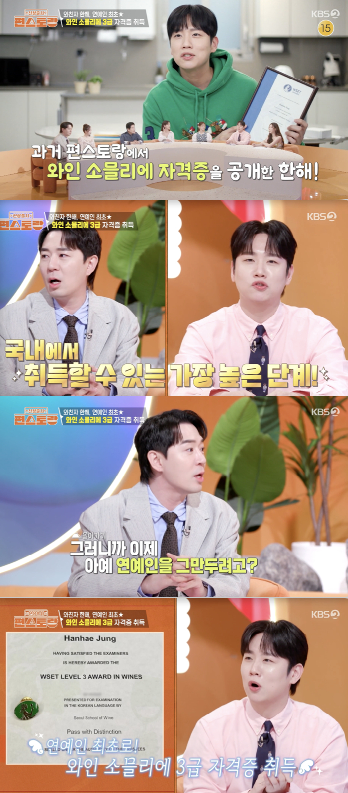 이날 MC 붐이 "요즘 어떻게 지내느냐"고 묻자, 한해는 "다음 레벨 자격증을 땄다"며 와인 관련 국제 자격증인 WSET(Wine & Spirit Education Trust) 레벨 3를 연예인 최초로 취득했다고 밝혔다.