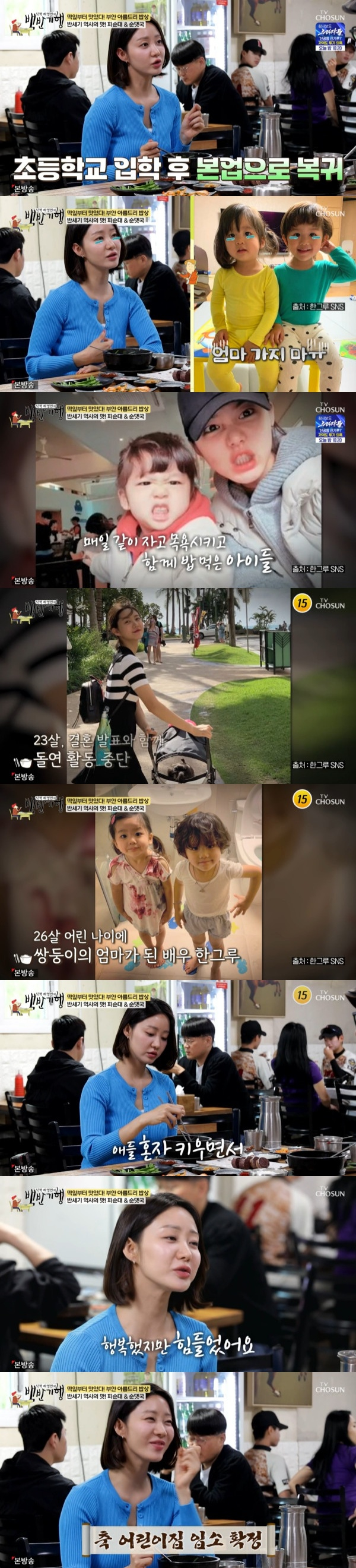 또한 한그루는 "애들 혼자 키우면서 되게 소소한 행복을 느끼면서도 너무 힘들었다. 제일 기뻤을 때는 아기들 어린이집 입소가 확정되었을 때다. 그 문자를 보고 막 울었다. 너무 힘드니까 그게 소원이었다"라고 독박 육아의 고충을 토로했다.