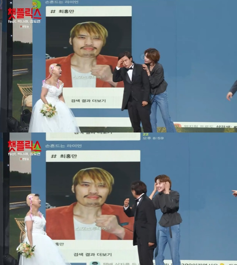 박나래, 장도연은 박성광과 함께 '챗플릭스'란 코너에 등장했다. '챗플릭스'는 관객들의 실시간 채팅에 따라 상황극이 펼쳐지는 코너였다.