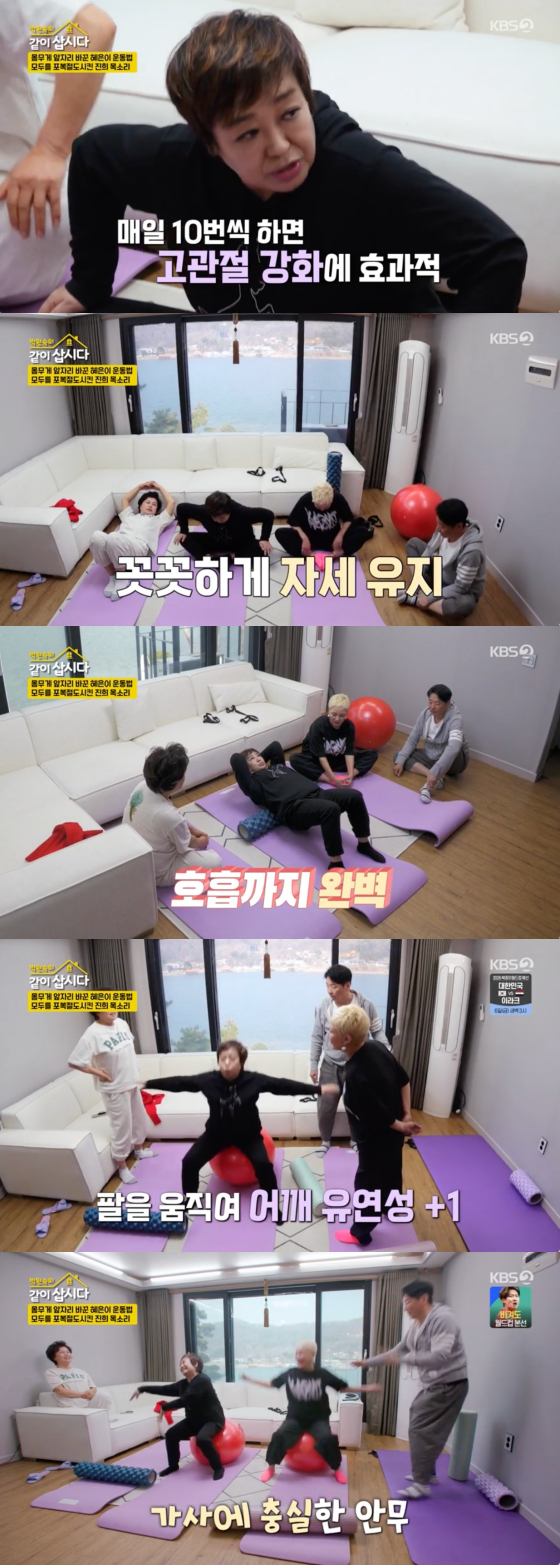이날 두 달 만에 체중 8kg을 감량한 혜은이는 폼롤러와 짐볼로 집에서도 간단히 따라할 수 있는 운동법을 소개했다.