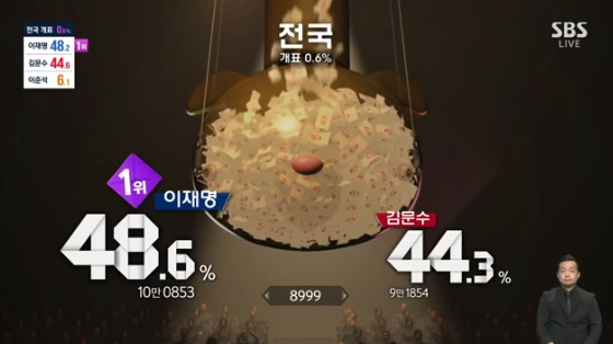 3일 방송된 SBS 개표방송 '2025 국민의 선택'에서는 이재명 더불어민주당 후보와 김문수 국민의 힘 후보의 개표상황을 넷플릭스 시리즈 '오징어 게임' 속 참가자들을 연상케 하는 컴퓨터그래픽(CG)으로 패러디한 모습이 그려졌다.