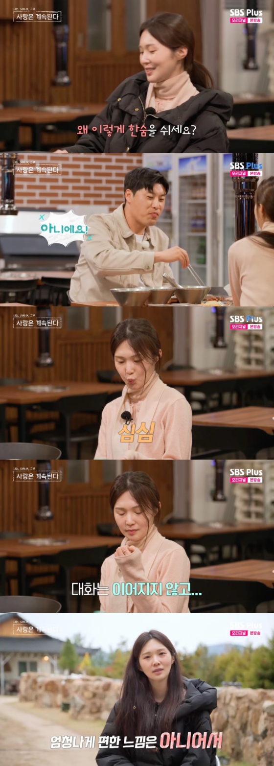 옥순 앞에서 긴장한 영철은 자기도 모르게 한숨을 내쉬었다. 그러자 옥순은 "왜 한숨을 쉬냐. 저랑 있는 게 불편하냐"고 물었다.