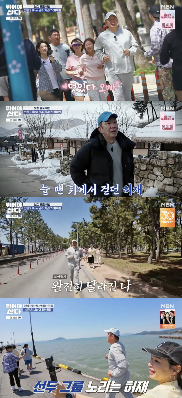 7일 방송된 MBN 예능 프로그램 '뛰어야 산다' 8회에서는 21km 하프 마라톤 전원 완주 이후, 회복런을 위해 보성 율포 해변에 다시 모인 멤버들의 모습이 그려졌다.