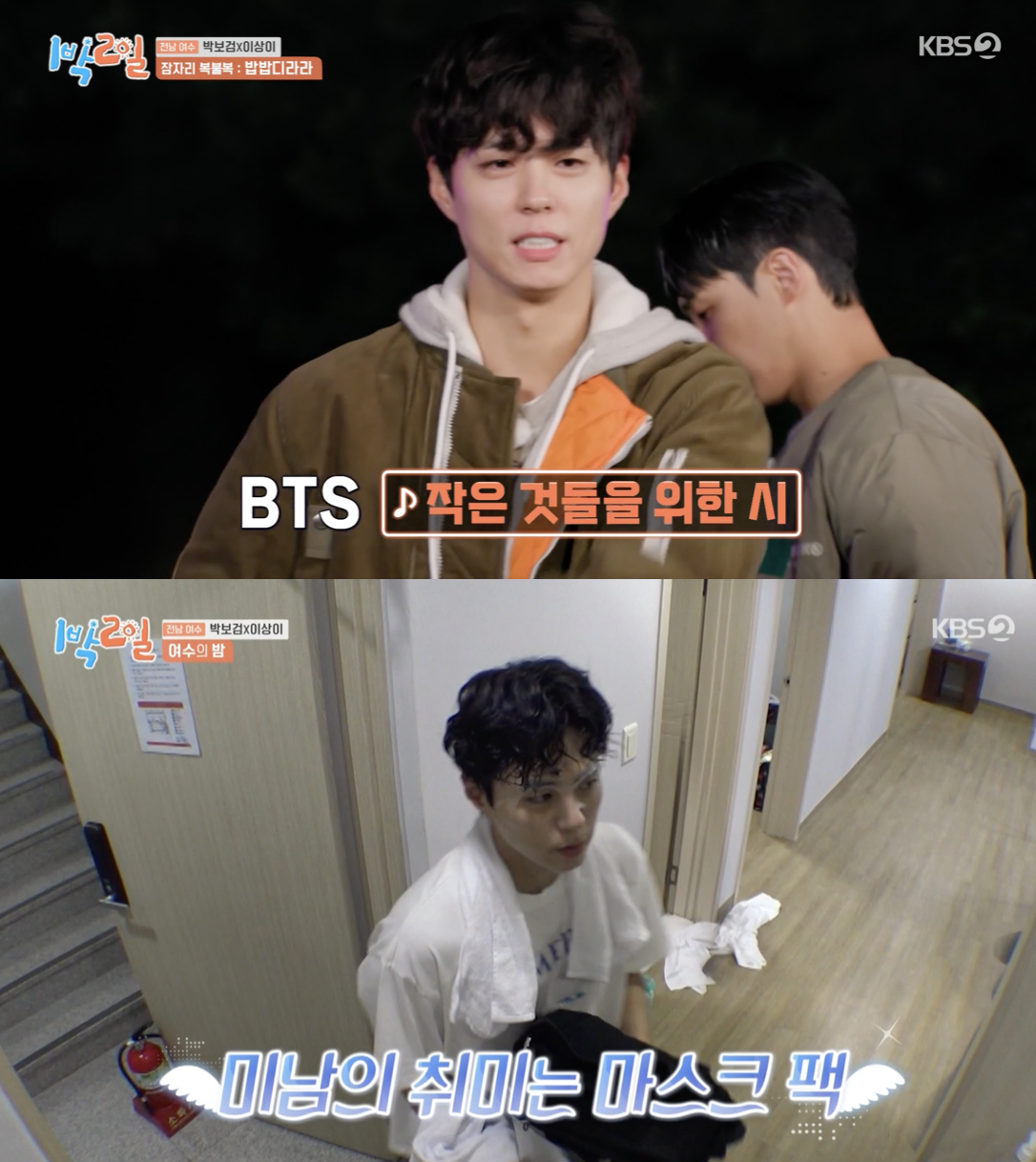 취침 준비에 돌입한 박보검은 윗층에서 샤워를 마친 뒤, 곧장 마스크팩을 얼굴에 붙이며 피부 관리에 들어갔다. 이를 지켜보던 제작진은 작은 얼굴 가득 붙은 팩을 보고 "팩 붙이고 여백이 하나도 없다"며 감탄을 쏟아냈다.