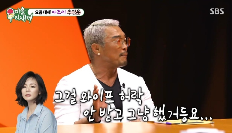 이날 스페셜 MC로 출연한 '대세 아조씨' 추성훈은 "유튜브에서 집을 공개하고 가정의 평화가 깨졌다는 게 무슨 말이냐" MC 서장훈의 질문에 "집을 더러운 채로 허락 없이 공개해서 아내가 채널을 없애라고 화를 냈다"라고 밝혔다. 이어 아내가 바퀴벌레로 변해 있으면 어떻게 할 거냐는 질문에 추성훈은 "키워 주긴 해야 하는데 통장은 내가 차지하겠다"라는 대답으로 모두를 웃겼다.