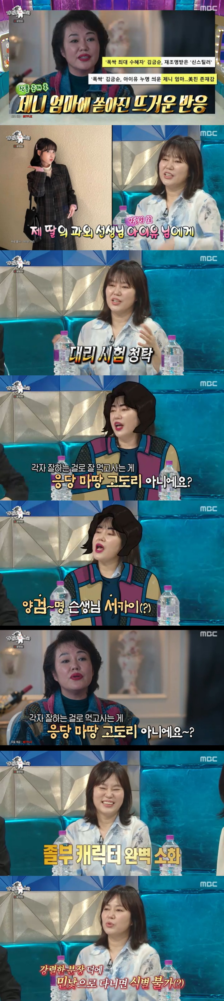 김금순은 "이번에 '개그콘서트'도 출연했다. 이현정 개그맨이 제니 엄마 연기를 하고 있더라"라고 인기를 자랑했다.