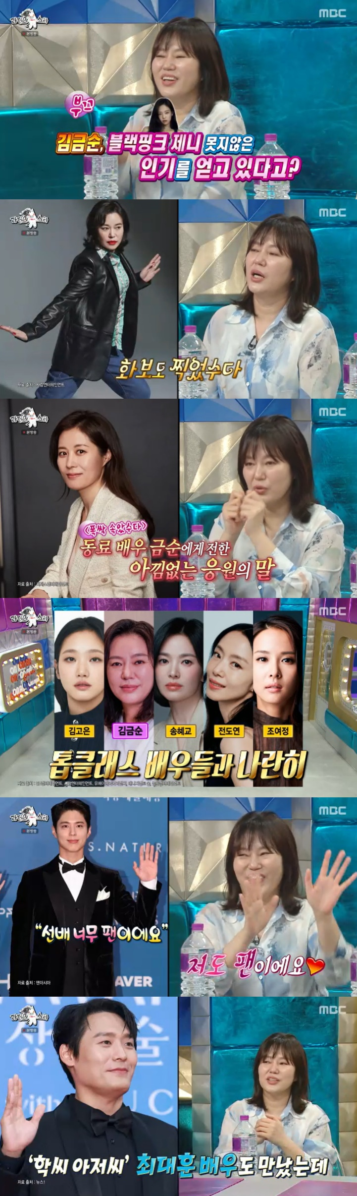 MC 장도연은 "블랙핑크 제니 인기도 부럽지 않다더라"라고 하자 김금순은 "극단에서 연락이 끊어진 배우들도 30년 만에 연락이 왔다. 제가 너무 사랑하는 문소리 배우도 '너무 잘 봤다. 팬이다'라고 메시지를 보내주셨다. 늘 TV에서만 본 연예인 분들이 연락을 주셨다"라고 말했다.