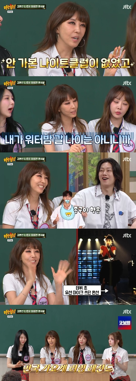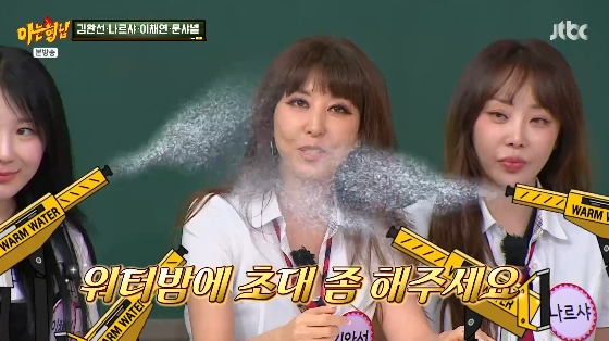 이에 김완선은 "내가 안 가본 군대가 없었고, 안 가본 나이트클럽이 없었고, 안 가본 지방행사가 없었다"라고 자랑했다. 서장훈은 "김완선이 워터밤에 뜨면 난리 나겠다"라고 말하자 이수근은 "감기 걸려. 누나 지켜줘야지. 감기 걸리게 하루종일 물 맞히고 있냐"라고 걱정해 웃음을 유발했다. 신동 역시 "그날만은 미지근한 물로 해달라"라고 거들어 모두를 폭소케 했다.