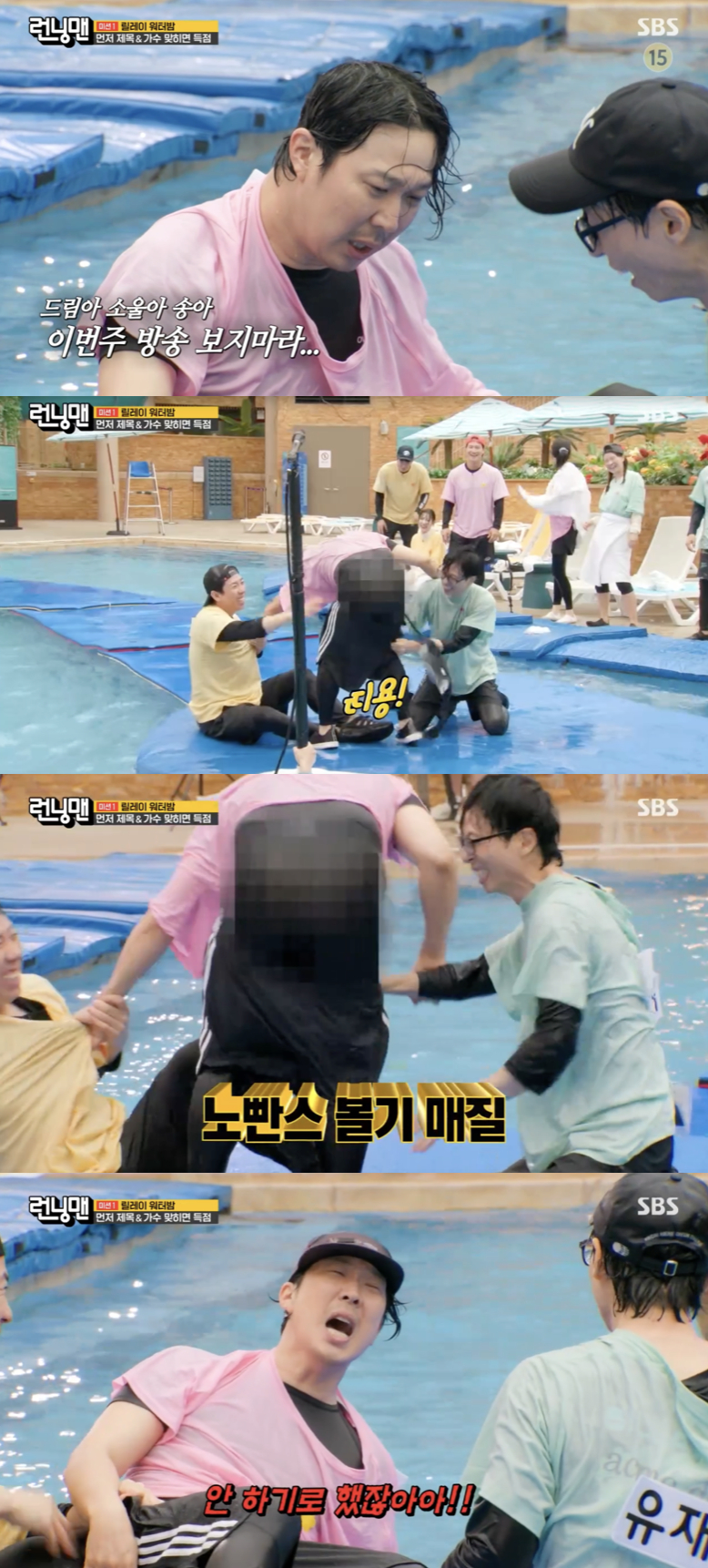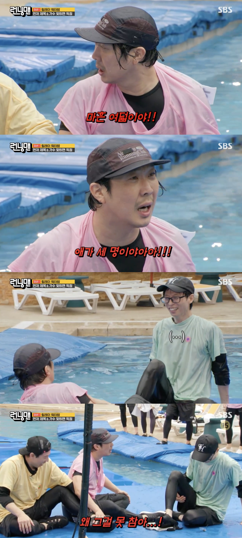 이날 수영장에서 진행된 첫 번째 미션 '릴레이 워터밤'은 노래 간주에 맞춰 부표 위에서 제목과 가수를 맞히는 게임으로 꾸며졌다.