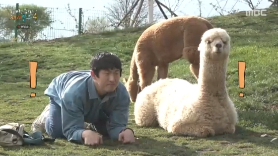 그런가 하면 이들은 알파카 두마리에게 자연스럽게 접근하기 위해 네 발로 풀 뜯는 시늉을 하며 다가가 모두를 폭소케 했다. 그러던 중 빠니보틀의 손에 똥이 묻었고, 알파카들이 유독 그에게만 관심을 가져 웃음을 유발했다.
