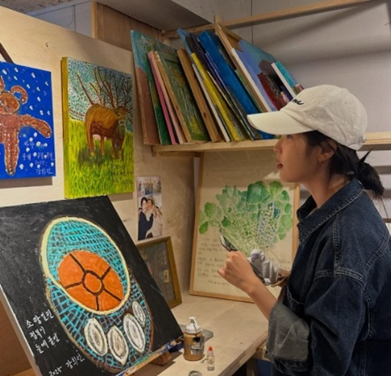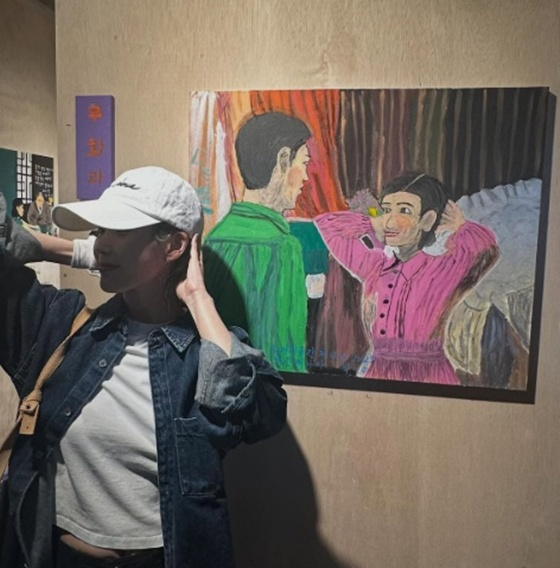 공개된 사진 속 아이유는 제주도에서 진행되고 있는 전시회에 찾아 사진을 남겼다. 그는 그림을 집중해서 보는가 하면 그림 속 장면을 직접 따라 해 눈길을 끌었다.
