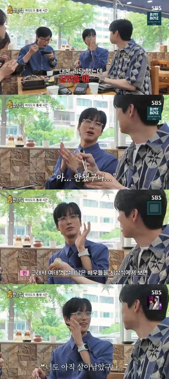 이후 또 신인시절 얘기가 나오자 남궁민은 드라마 대본 리딩 후 하차됐던 사실을 밝히기도 했다. 그는 "대본리딩하고 식사자리에서 술도 마시고 친해졌는데 잘렸다. 혼자 못나가는데 나머지 사람들이 TV에 나올때 '내 자리에 추가된 사람이 누구지?' 찾아봤다"라며 "여태까지 살아남은 사람들을 시상식에서 보면 '너도 아직 살아남았구나'라는 생각이 든다"고 전했다. 이에 유재석은 "나도 그런 동지애 같은 게 생긴다"고 공감했다.