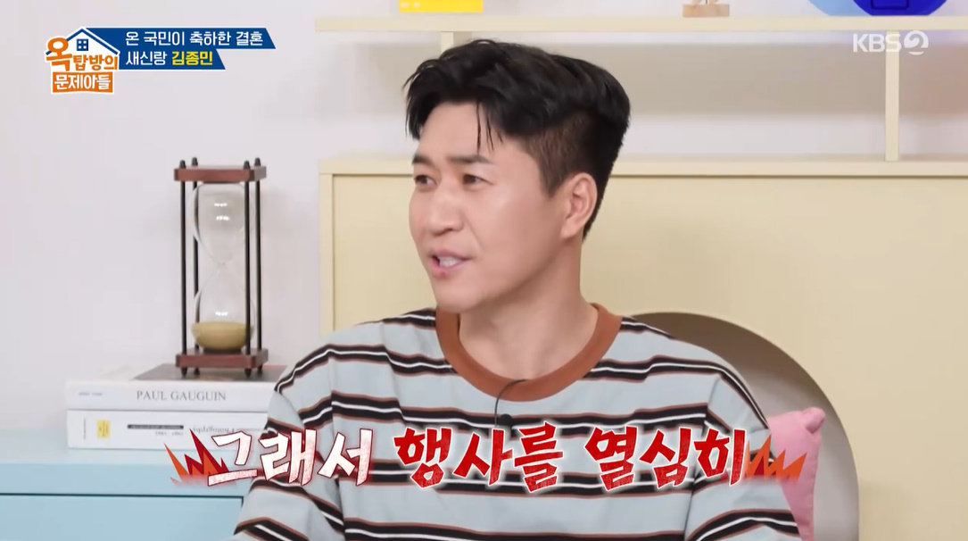 19일 오후 방송된 KBS 2TV '옥탑방의 문제아들'(이하 '옥문아')에서는 연예계 최고 화제의 결혼식을 올린 김종민이 방문해 예능 화석으로 든든하게 자리매김하고 있는 저력에 대해 공개하는 모습이 그려졌다.