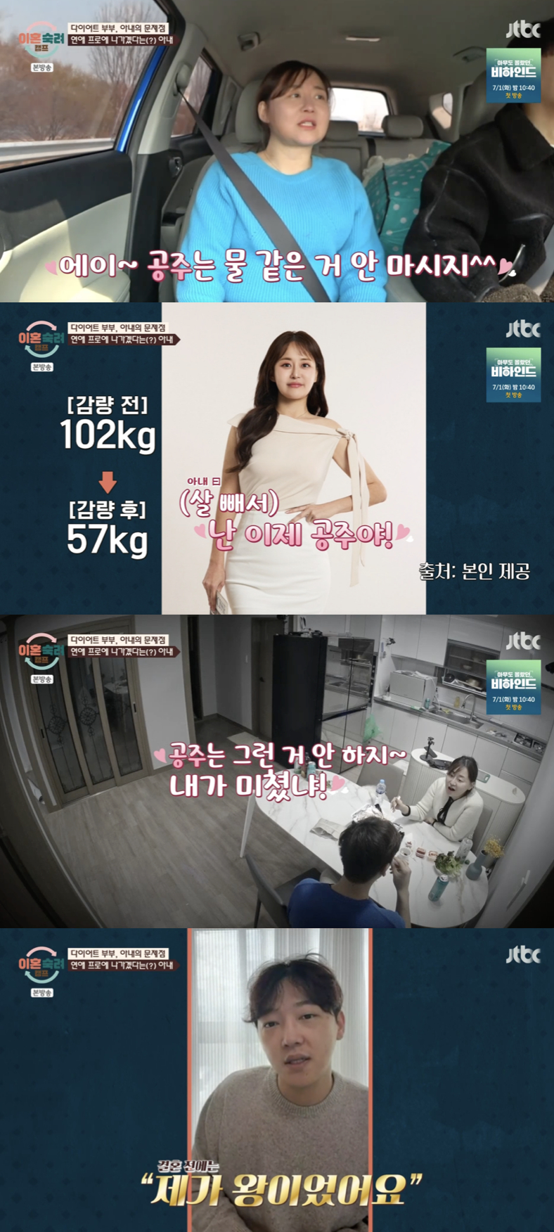 남편은 "아내가 감량 전 102kg에서 57kg를 뺀 이후부터 스스로를 '공주'라고 부르기 시작했다"고 설명했고, 실제로 아내는 "공주는 그런 거 몰라", "공주 목말라" 등 공주를 자칭하며 남편에게 심부름을 시키는 모습을 보였다.