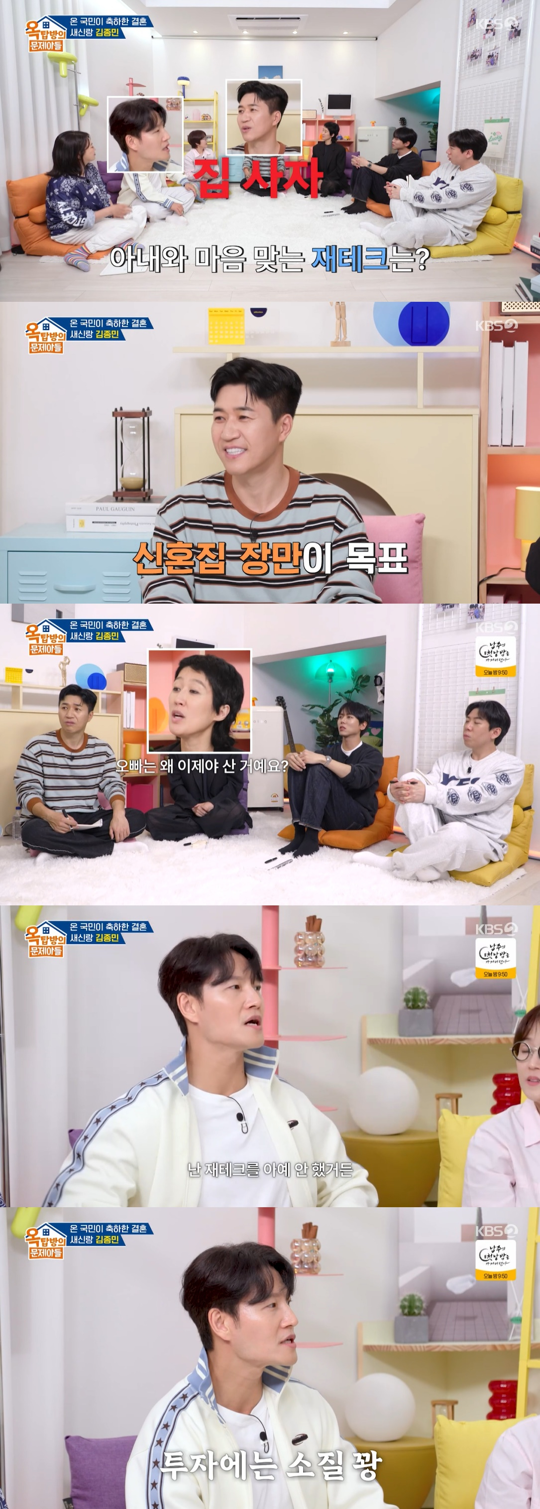 이날 김종민은 자신의 재테크 방법에 대해 "주식은 손만 대면 마이너스다. 유튜브 보고 한다"면서 "재테크는 안 하는 게 나은 것 같다"라고 솔직하게 고백했다. 이에 주우재는 "전형적으로 꼬라박는 스타일이구나?"라며 돌직구를 날렸고, 김종민은 "경제권은 와이프와 같이 들여다보고 있다. 출연료와 수익도 다 공개돼있다. 그걸 보고 '나 어디 투자하려고 해'라고 하면 아내와 상의를 해야 한다. 아내가 재테크를 잘 하는데 나한테 하지 말라고 하더라"라고 말해 웃음을 자아냈다.