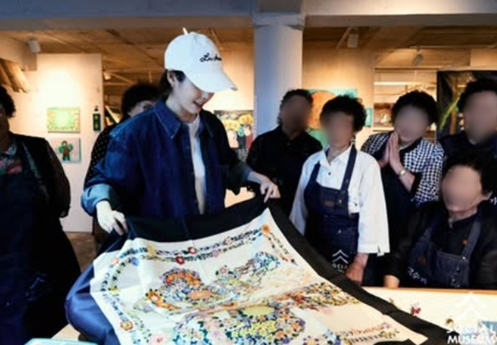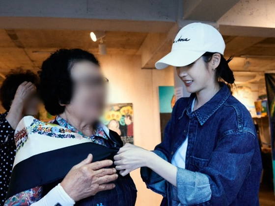 아이유는 이날 할머니 작가들을 위해 명품 에르메스 스카프를 직접 매주는 등 선물을 전해 눈길을 끌었다.
