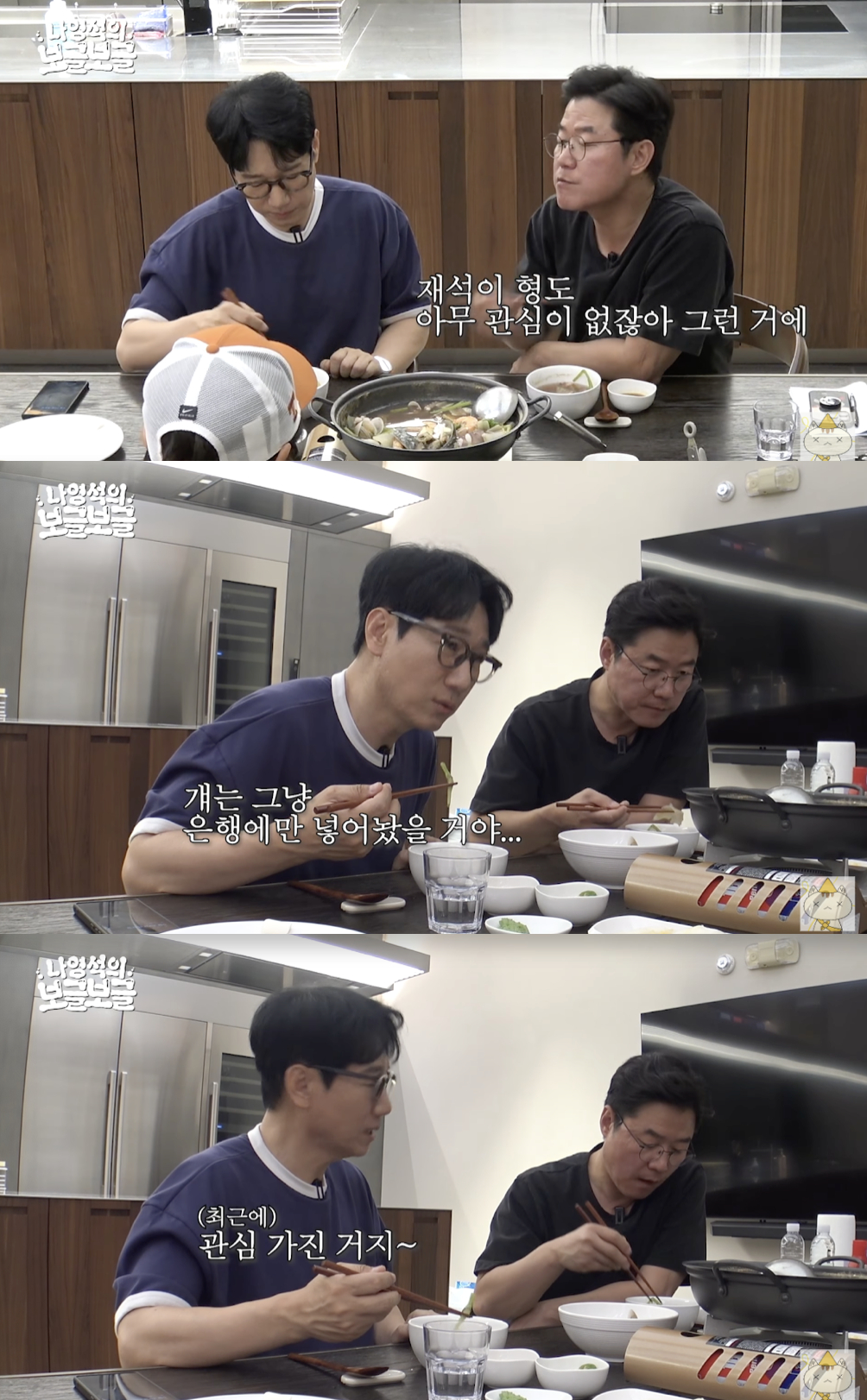 이에 나영석 PD는 "형한테 그런 걸 물어보냐. '런닝맨' 멤버 그렇게 많은데?"라고 되묻자, 지석진은 "(김)종국은 모른다. 하하도 모른다. (유)재석이가 최근에야 관심 갖기 시작한 거지. 걔는 그냥 은행에만 넣어놨을 거야"라고 말해 웃음을 자아냈다.