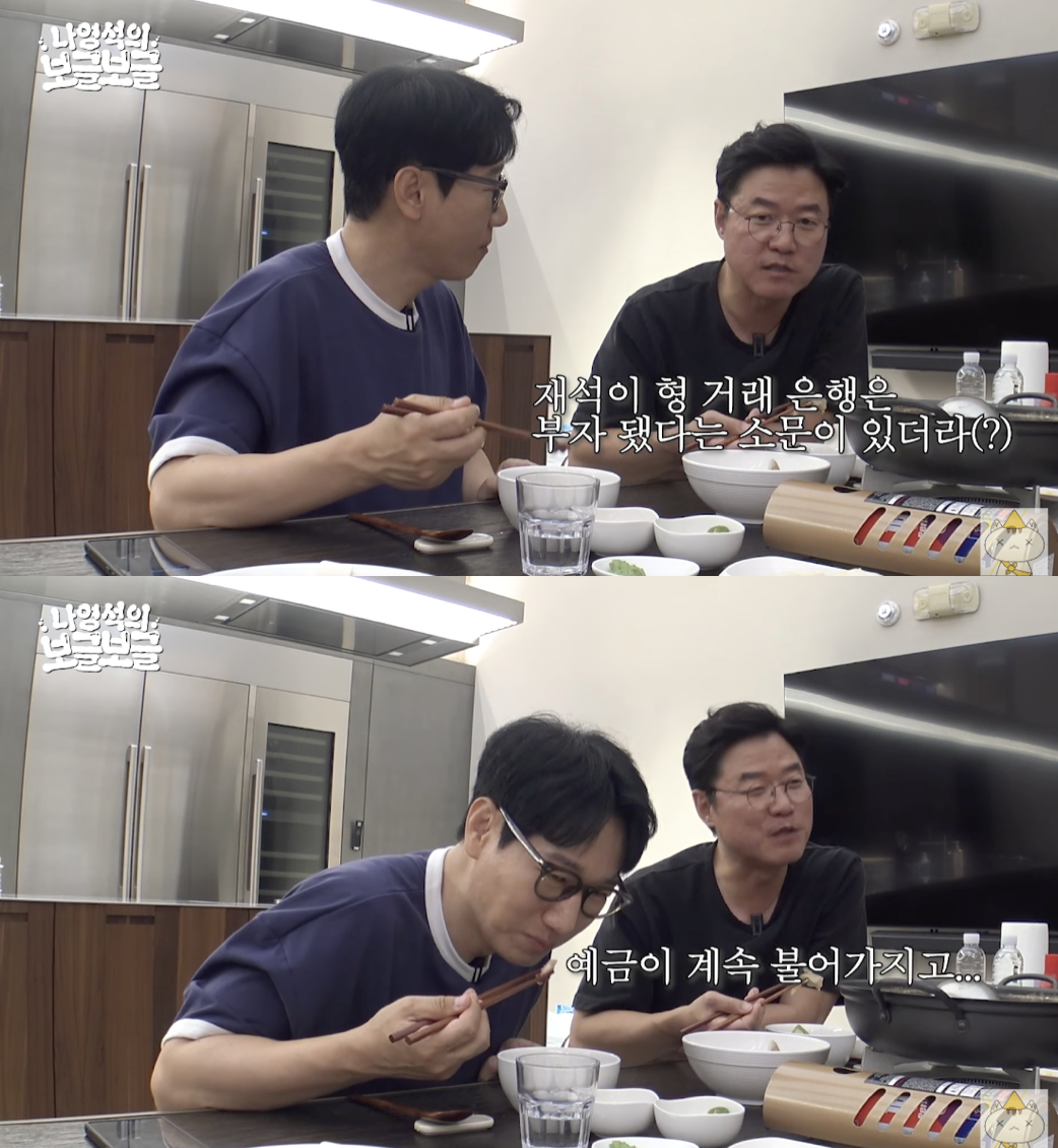 나영석 PD도 이에 공감하며 "재석이 형은 원래 그런 거에 관심이 없다"며 "그래서 재석이 형 주거래 은행이 부자가 됐다는 소문이 있다. 예금이 계속 쌓여서…"라는 농담을 덧붙였다.