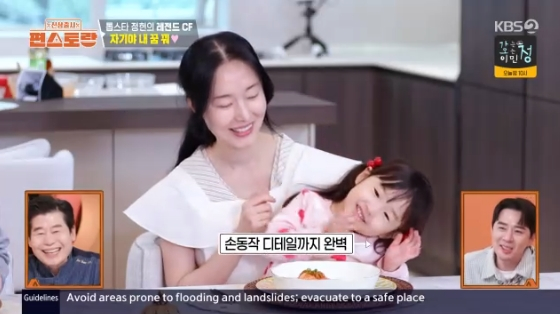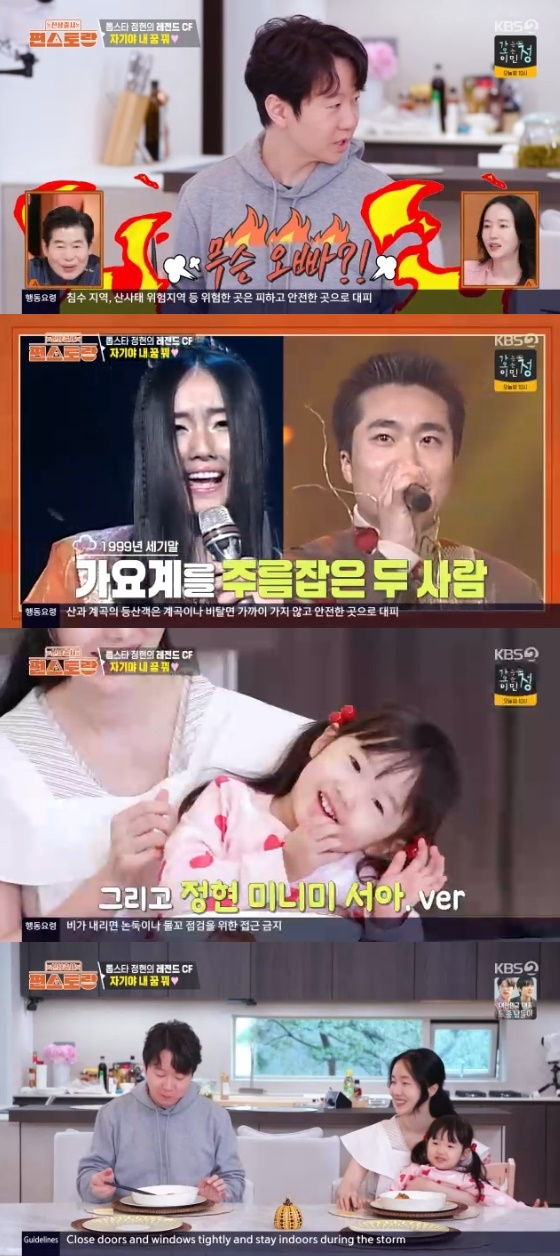 이정현은 또 그 시절 조성모와 함께 찍은 휴대전화 CF의 한 장면을 재연해 눈길을 끌었다. 그는 당시 화제를 모았던 "잘자. 내 꿈 꿔"라는 멘트를 재현했고, 이를 보던 첫째 딸 서아가 똑같이 따라 해 엄마 미소를 유발했다.
