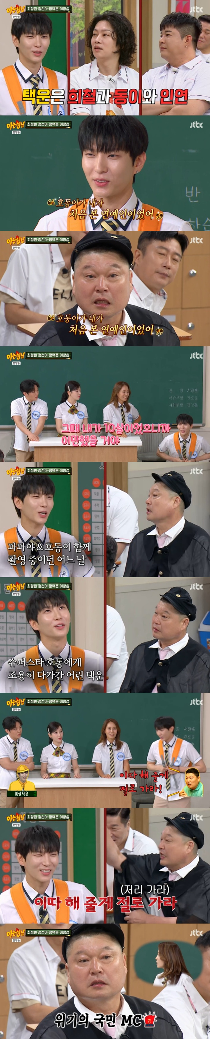 강호동이 "아이돌 후배니까"라고 하자 정택운은 "호동이가 내가 처음 본 연예인이었다"라며 "내가 10살 때 호동이가 파파야 선배님과 촬영 중이었다"라고 회상했다.