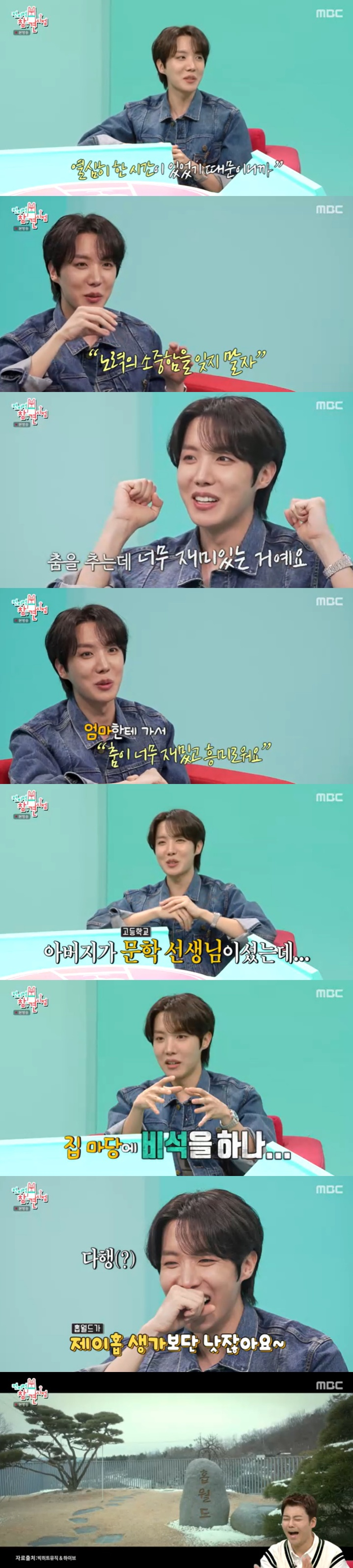 제이홉은 초등학교 5학년 때부터 춤에 관심이 생겼다며 "수련회 때 춤을 췄는데 희열이 있더라. 엄마한테 말해서 학원 가서 춤을 배웠다. 아버지는 그때 고등학교 문학 선생님이었는데, '머리도 좋은 애를 왜'이라고 하셨다. 지금은 누구보다 응원해 주신다"라고 밝혔다. 제이홉은 "저도 깜짝 놀랐는데 집 마당에 제 비석(홉 월드)을 하나 세웠더라"라고 밝혀 놀라움을 자아냈다.