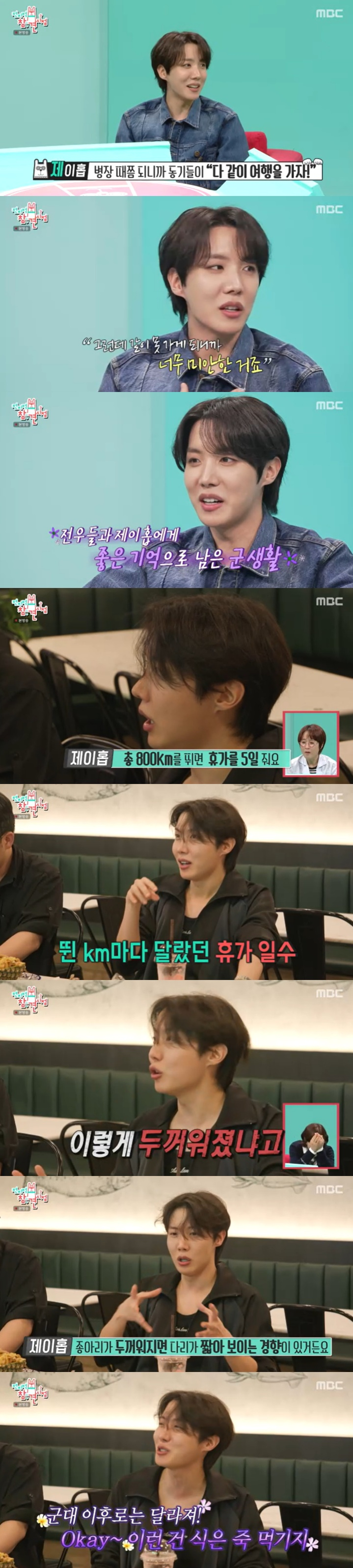 제이홉은 최근 콘서트 때 군대 후임이 찾아왔다며 "내 입으로 말하긴 민망하지만 난 군생활 잘했다"라고 말했다. 홍현희가 "군대 동기 MT 비용을 다 내줬다고 하더라"라고 하자 제이홉은 "너희가 MT 가는 비용을 전액 지원하겠다고 했다"고 밝혔다. 제이홉은 "공인 입장으로 군대에 들어갔는데 나와 함께했던 군 생활의 추억들이 술 안주거리가 될 수 있겠다 싶어서 더 친구처럼 하려고 했다. 전우들도 좋은 추억이었다고 하고 아직까지 연락한다"고 말했다.