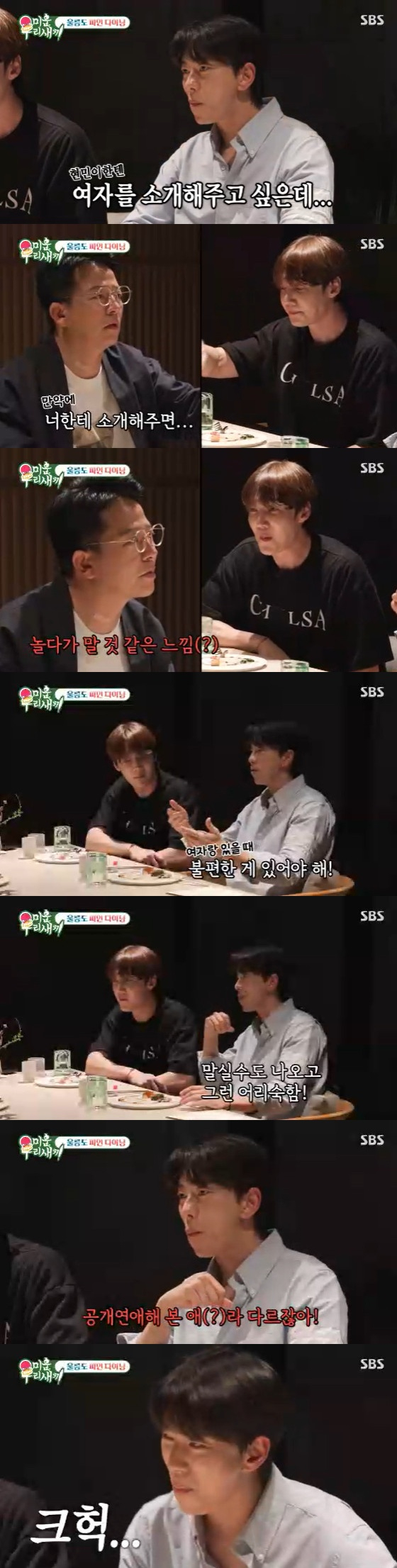 이내 김준호는 "왜냐하면 (윤)현민이에겐 여자를 소개해 주고 싶은데, 너(최진혁)는 소개해 주면 그냥 놀다가 말 거 같은 느낌이다. 괜찮은 여자도 여사친(여자 사람 친구)으로 만들어서 친하게 지내는 느낌 말이다. 그럼 쉽지 않아"라고 설명했다.