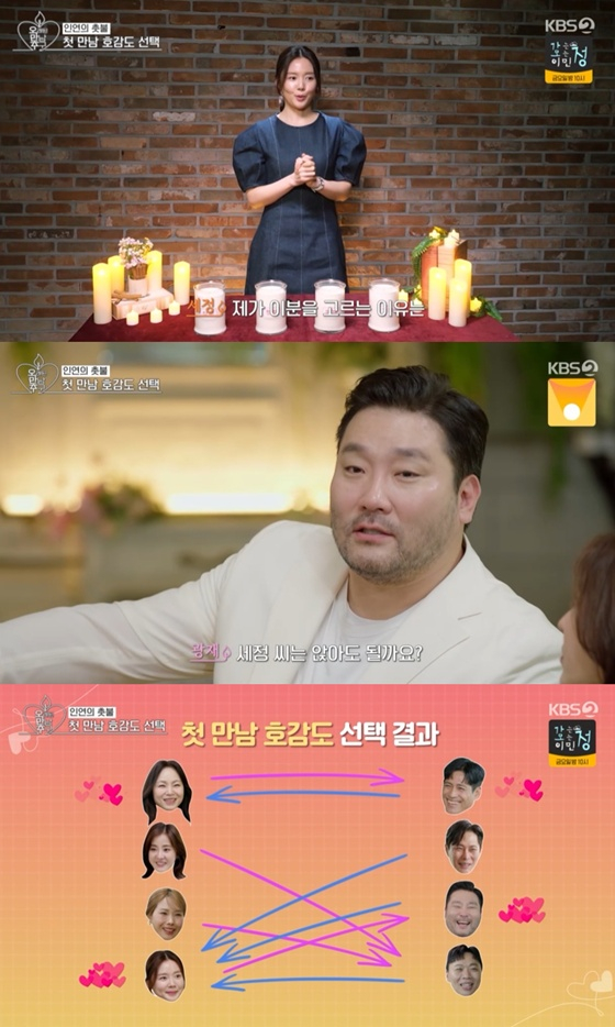 앞서 박광재 역시 "첫인상이 챙겨주고 싶은 느낌이었다"며 강세정을 선택했다. 강세정은 이날 이상준, 이기찬, 박광재에게 선택받았다.